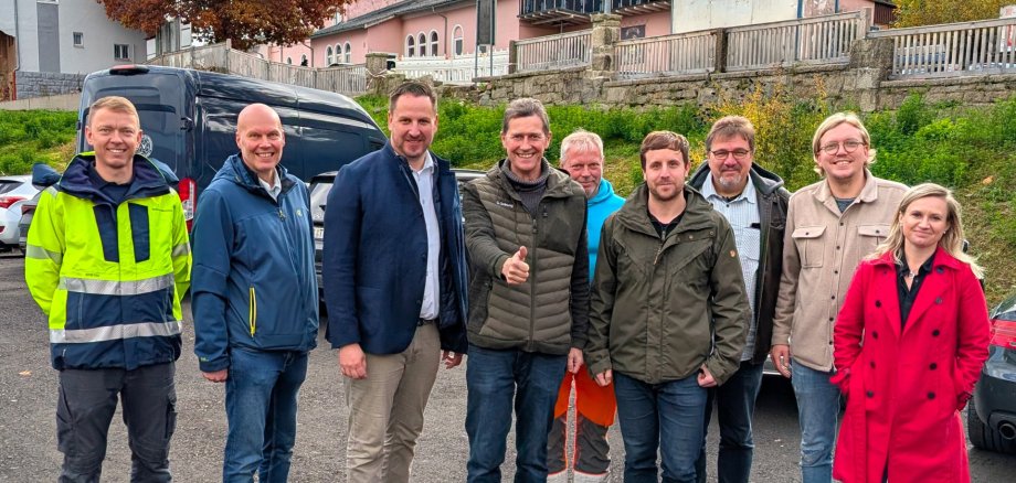 Auf dem Bild von links: Andreas Horn (Strommeister Stadtwerke Münchberg), Tobias Kasparbauer (Geschäftsführung Stadtwerke Münchberg), Bürgermeister Christian Zuber, Günter Ordnung (Vorsitzender Werbegemeinschaft Münchberg), Alexander Mitschke (Stadtbauhof Münchberg), Johannes Hüttner (Leitung Stadtbauhof Münchberg), Alexander Heinritz (Werbegemeinschaft Münchberg), Christian Schmalz (Stadtmarketing) und Ina Hajcenko (Kulcity-Managerin)