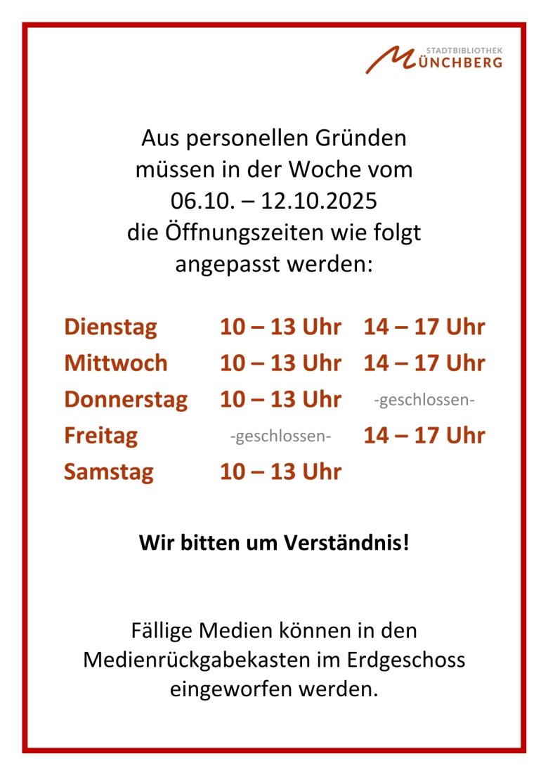 Geänderte Öffnungszeiten 06.10. - 12.10.2025